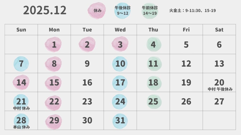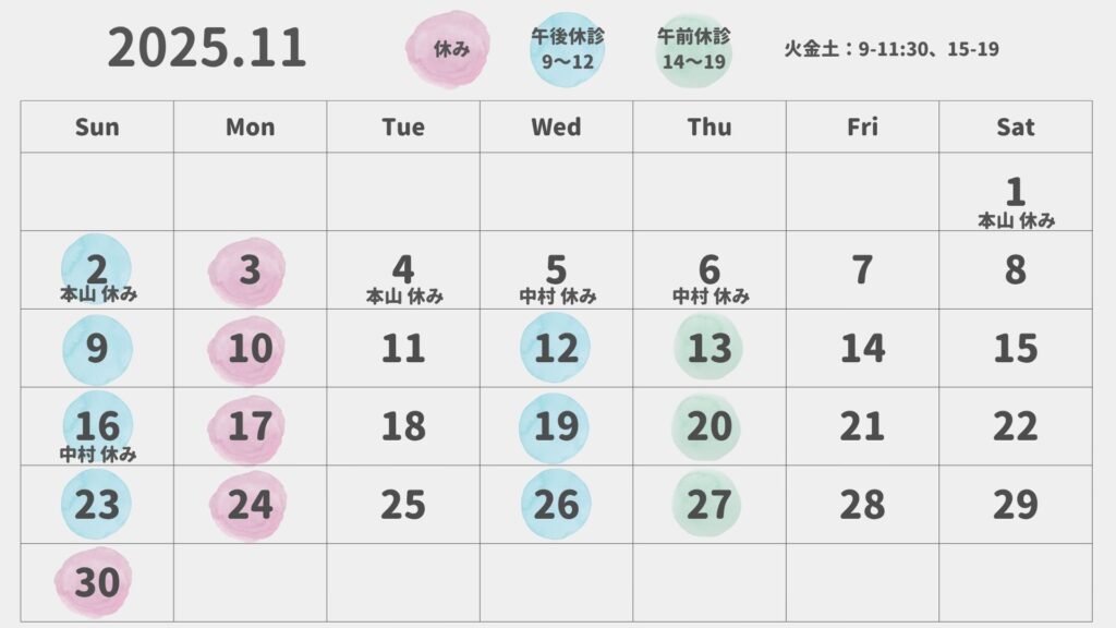 春宵堂治療院2025年11月休業日のお知らせ 2025.10.25 春宵堂治療院、11月の休業日のお知らせです。 11月30日~12月3日まで4連休をいただきます。 各鍼灸師のお休みは以下の通り。 ※月曜日は定休日です。 >>詳しい営業時間はこちら 春宵堂治療院2025年10月休業日のお知らせ 前の記事
